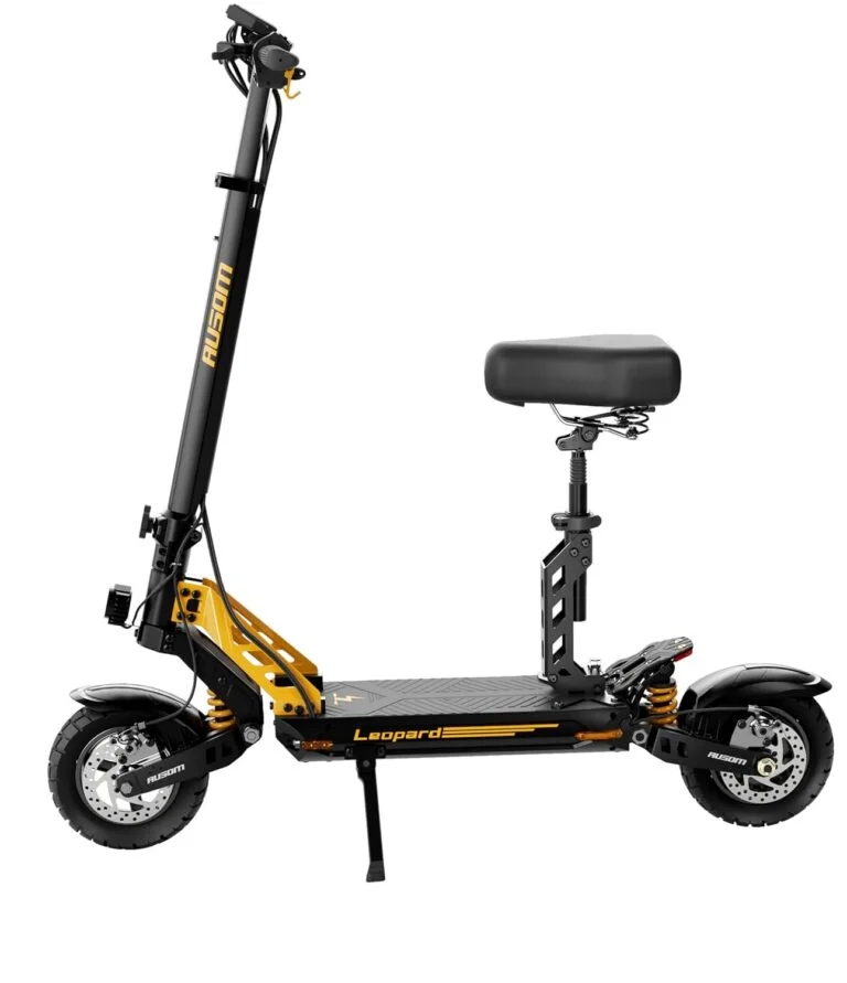 The Ausom Leopard electric scooter is a versatile and powerful scooter that caters to both urban commuters and off-road enthusiasts. Its robust 1000W brushless motor propels you to speeds of up to 34 mph, enabling you to effortlessly zip through city streets or navigate challenging terrain. With a long range of up to 52 miles on a single charge, the Leopard ensures you can explore your surroundings without worrying about running out of power. The scooter's dual suspension system provides a smooth and comfortable ride, even on bumpy surfaces, while its dual disc brakes offer reliable stopping power in all weather conditions. The Leopard's foldable design makes it convenient for storage and transportation, and its adjustable handlebars and removable seat allow for a customized ride. Whether you're commuting to work, running errands, or exploring new trails, the Ausom Leopard electric scooter is a capable companion that combines power, versatility, and convenience.